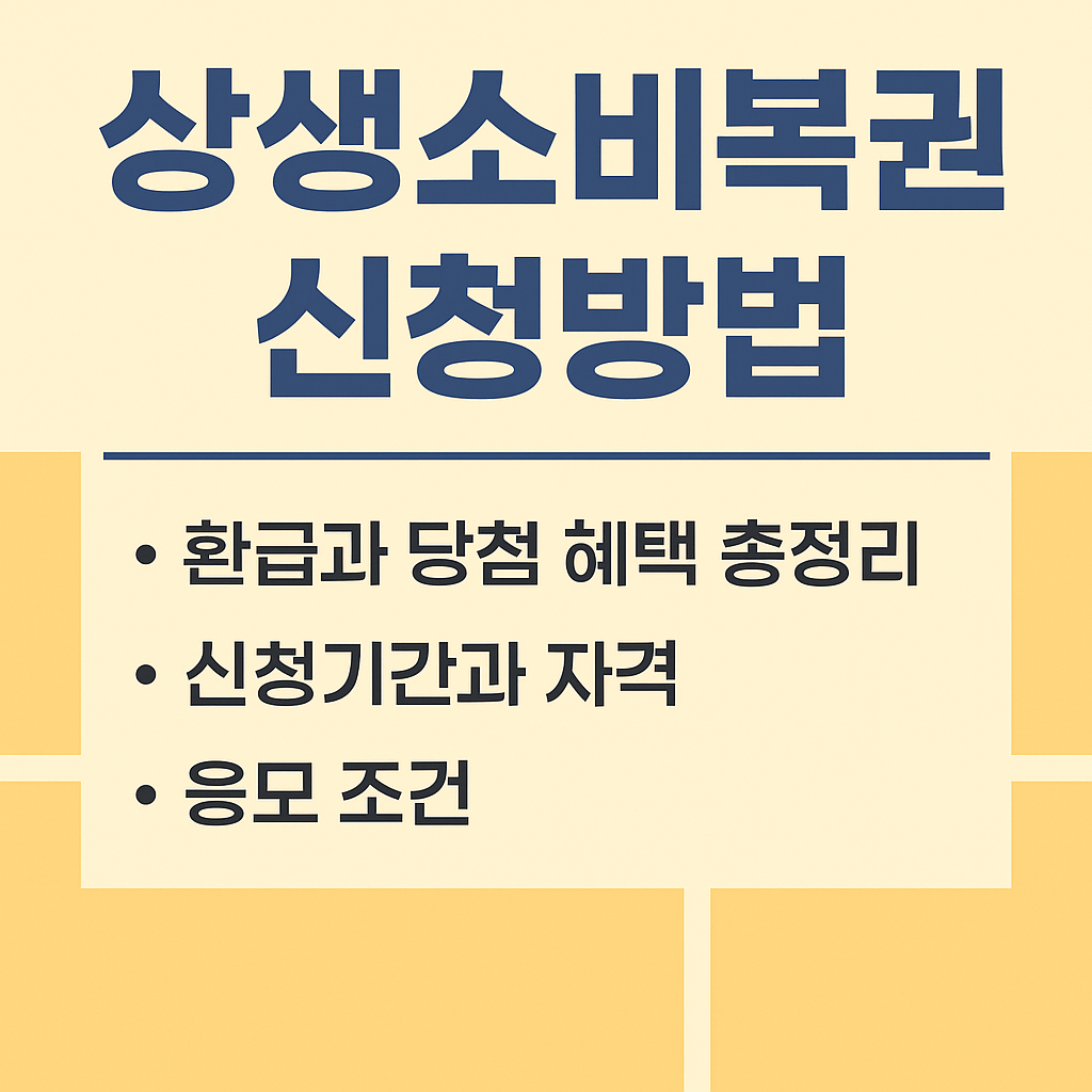 정부가 내수 경기 활성화와 소상공인 매출 회복을 위해 준비한 상생소비복권 신청방법은 2025년 가장 주목받는 정책입니다. 단순히 소비를 장려하는 데 그치지 않고, 소비자에게 환급과 복권 당첨이라는 두 가지 실질적 혜택을 동시에 제공한다는 점에서 큰 매력을 갖고 있습니다. 목차상생소비복권 기본 개념신청기간과 자격응모 조건당첨 혜택과 환급 내용상생소비복권 신청 꿀팁마무리 정리 상생소비복권 기본 개념상생소비복권은 상생페이백 제도와 함께 운영됩니다. 즉, 상생페이백을 신청하면 자동으로 상생소비복권 응모 자격이 주어집니다. 따라서 한 번의 신청으로 두 가지 혜택을 동시에 누릴 수 있다는 것이 가장 큰 특징입니다. 신청기간과 자격신청기간: 2025년 9월 15일 ~ 11월 30일안내처 운영: 2025년 9월 15일..